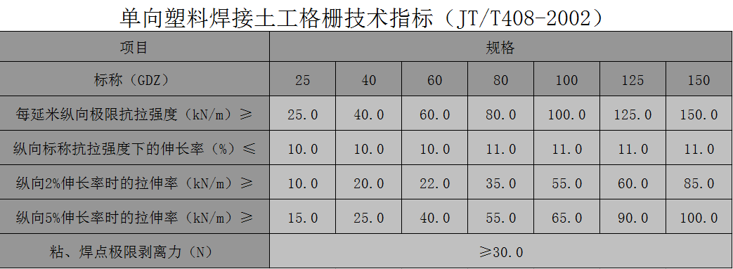 PP焊接土工格柵的肋帶系高分子塑料經(jīng)擠出拉伸成型 , 具有很高的抗拉強度 . 其縱橫向肋帶的交接點以高頻超聲波焊接 , 確保了產(chǎn)品質(zhì)量的穩(wěn)定 , 保證了格柵網(wǎng)格對土體的有效嵌鎖。同時格柵的強度可變更肋帶的拉力,調(diào)整肋帶的多少而設(shè)計成不同的型號規(guī)格。以滿足不同工程,各種技術(shù)指標的需要。